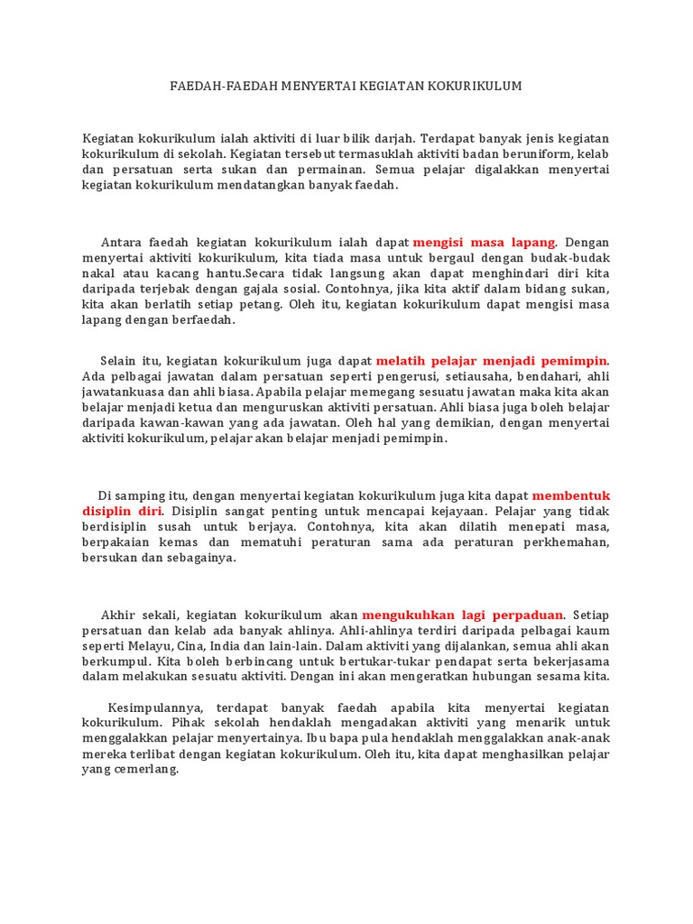 Huraikan kebaikan kegiatan kokurikulum di sekolah. Mereka sentiasa sibuk dengan aktiviti di sekolah. Faedah menyertai kegiatan kokurikulum contoh karangan upsr. Kesimpulannya, terdapat banyak faedah menyertai kegiatan kokurikulum. Kegiatan kokurikulum ialah aktiviti di luar bilik darjah.